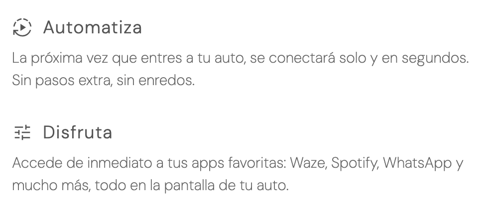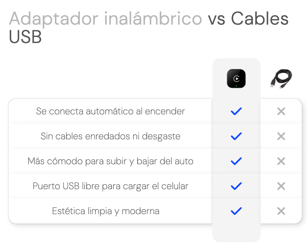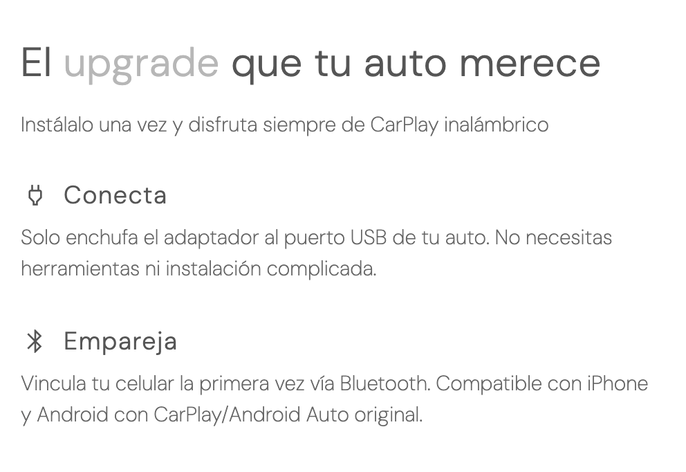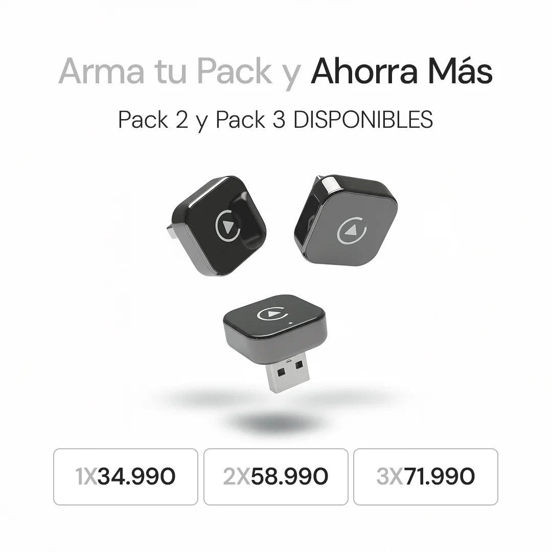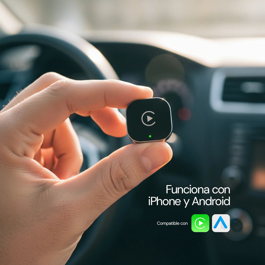 Es un adaptador compacto que convierte tu CarPlay o Android Auto con cable en una experiencia completamente inalámbrica. Lo conectas una sola vez al puerto USB del auto y tu teléfono se vincula automáticamente cada vez que enciendes el vehículo, sin enchufar nada. Te permite usar mapas, música, mensajes y tus apps habituales en la pantalla del auto con mayor comodidad, menos distracciones y una sensación mucho más moderna. Es una mejora simple, rápida y que transforma de inmediato tu manera de manejar.